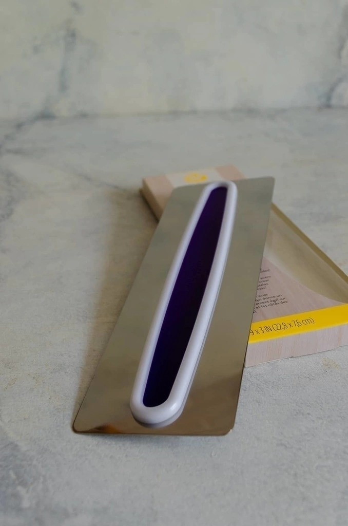 • El mango de agarre cómodo blanco y morado lo hace fácil de sostener, mientras que la cuchilla de acero suaviza la formación de glasé sin esfuerzo