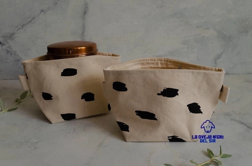 Contenedor Chico, confeccionado en lona estampada artesanalmente con tintas al agua. Interior forrado. Manijas de agarre.