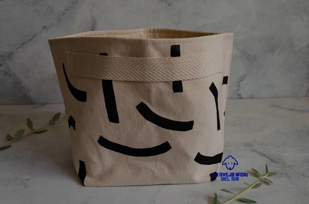 Contenedor mediano, confeccionado en lona estampada artesanalmente con tintas al agua. Interior forrado.